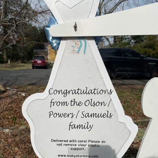 Welcome Baby Samuel! Try our new vineyard square monogram style it’s a chic look too. Baby Stork MD delivers 6ft. stork and baby carriage lawn signs to celebrate your new bundle of joy. Did someone say signature message please…add a note to the back of your gift.